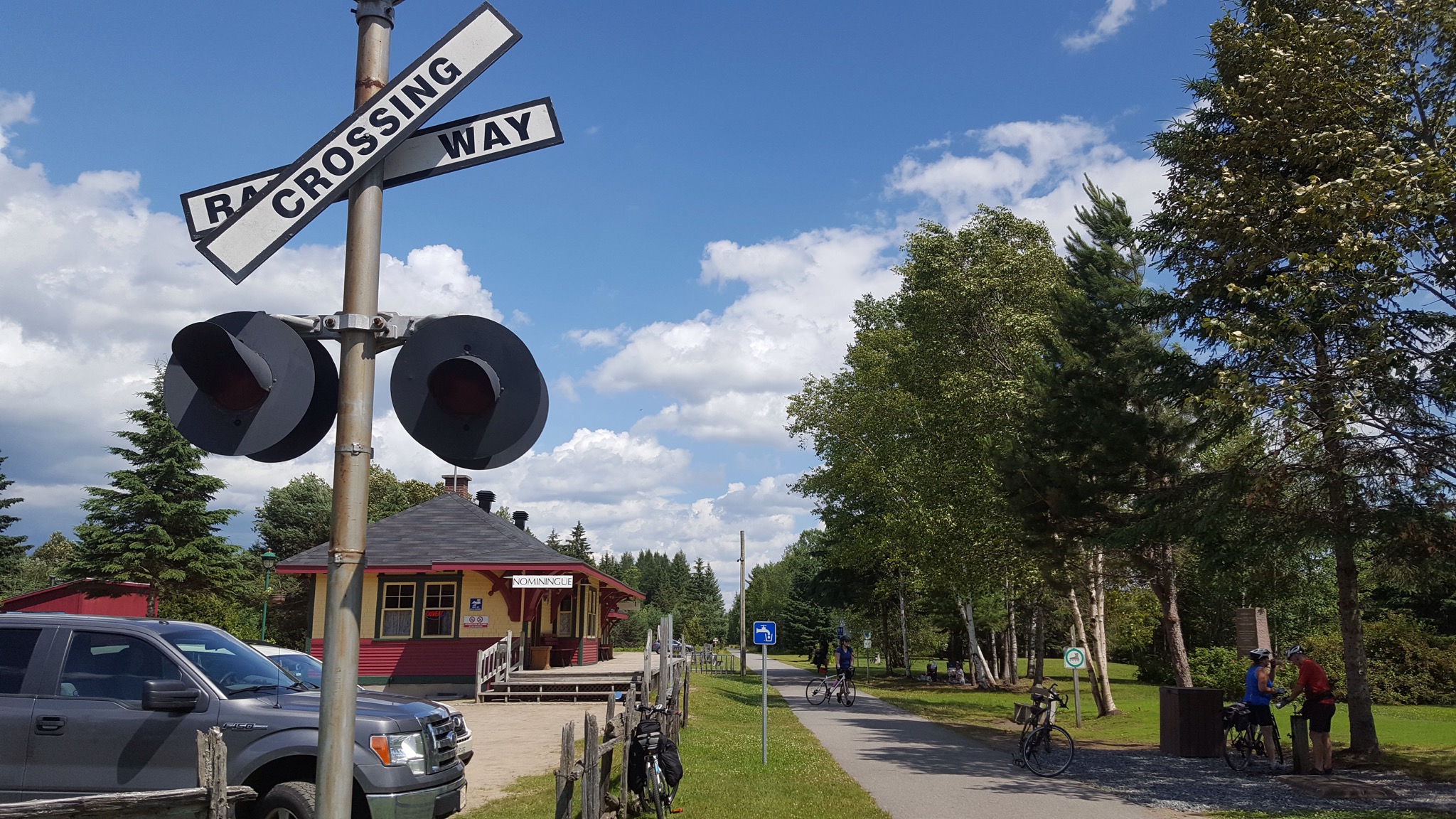 Our first stop for a snack came after we’d travelled a few miles.  We spotted a little restaurant/convenience store right off to the side of the trail.  There were several picnic tables outside under a shade awning and we noted a number of bikes parked there.  We figured it must be a popular stop for bicyclists.  We coasted to a stop and were just discussing what we wanted to eat, when a group of men sitting at the tables called out to us in French. There were 8 of them, all older gentlemen, enjoying cups of coffee.  We of course, did not understand them, and we shrugged our shoulders and said, sorry, English?