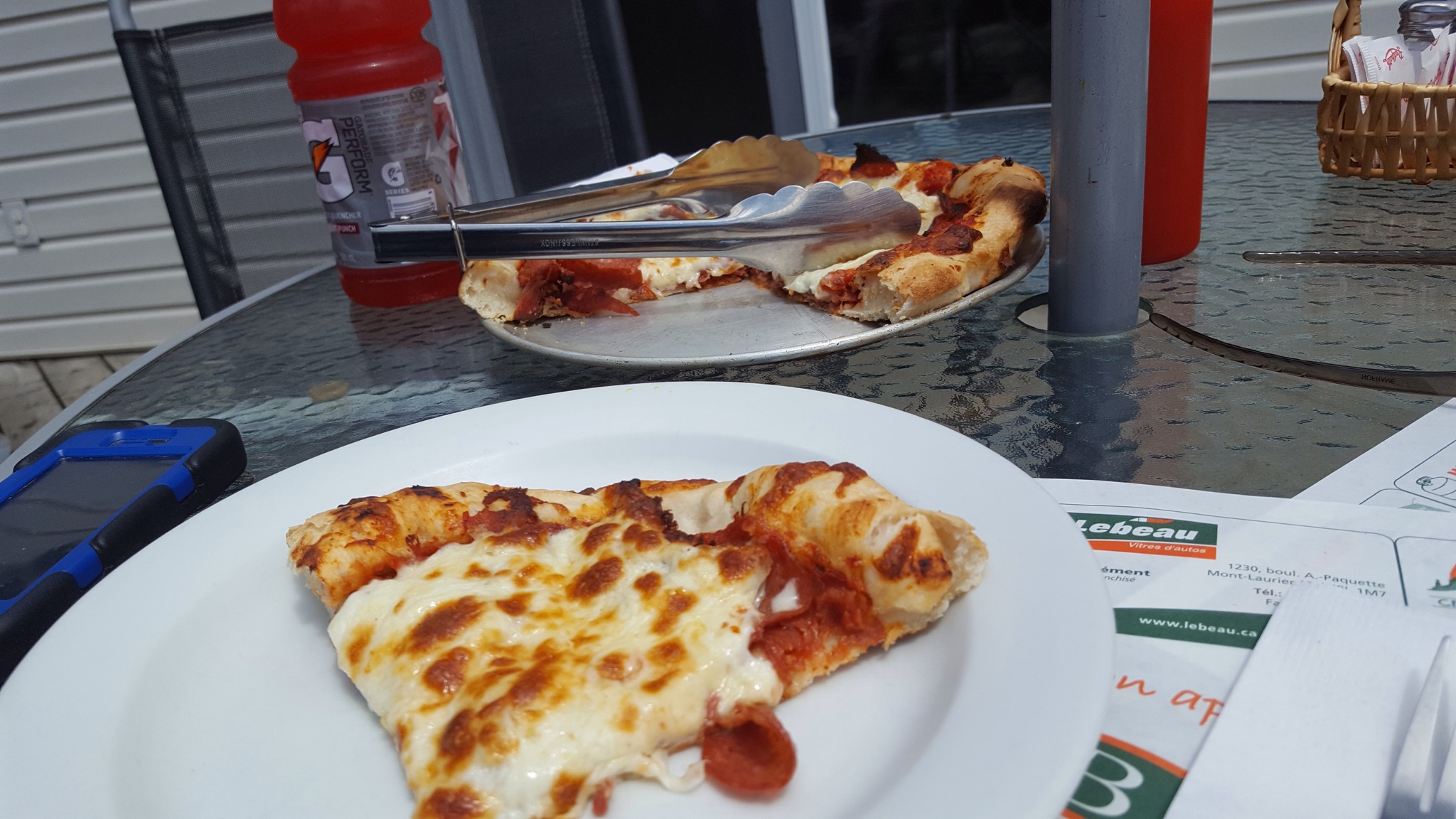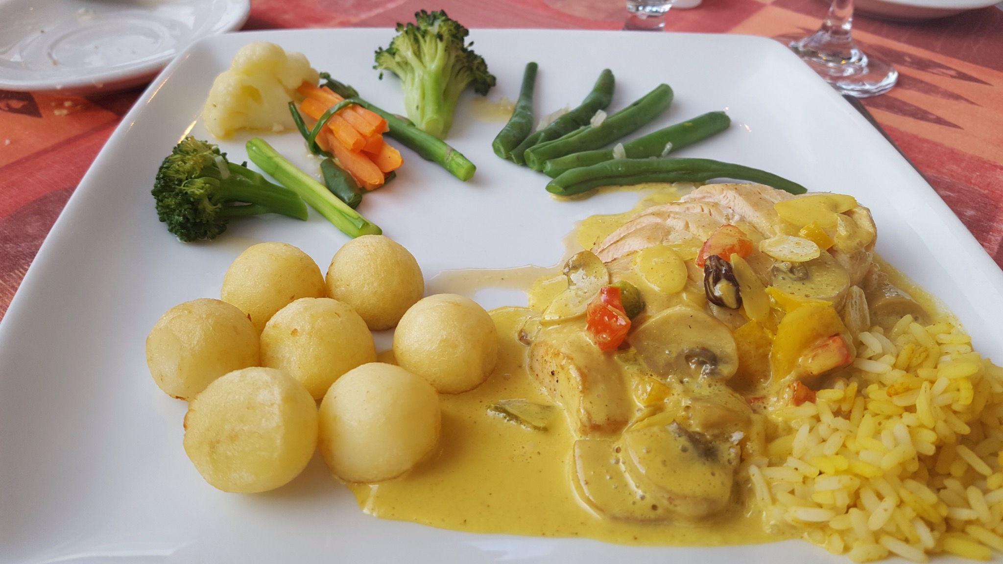 We had finished our snack and drank some water, bid our new friends farewell and jumped back on the trail. For lunch, we paid a return visit to the Resto-bar (don’t know what that means exactly, but many places are labeled resto-bar) where we’d eaten the day before.  We had a different server who did not speak English, but was very sweet.  She tried her best to communicate.  I felt a little more confident in my ordering today (I can’t imagine why), but nonetheless, I decided to try to figure out what to order from the menu that was printed all in French.  I saw the words pita, poulet (which from my extensive preparations for this trip, I knew meant chicken) and salade all on one line.  I figured that had to mean that I was ordering some kind of greek chicken pita thing.  And I was exactly right! It was delicious.