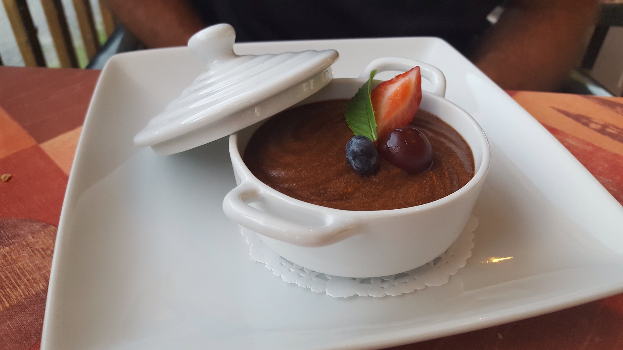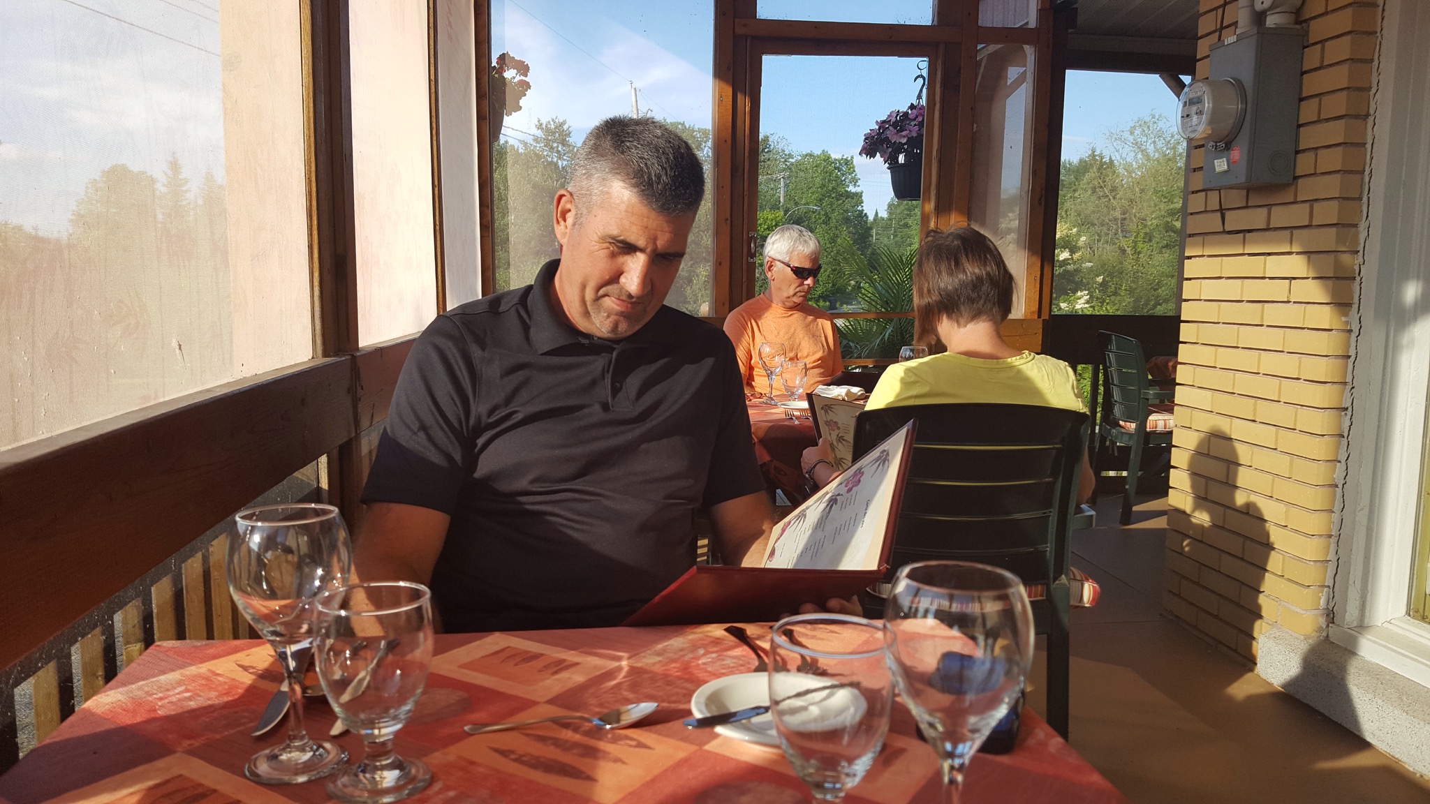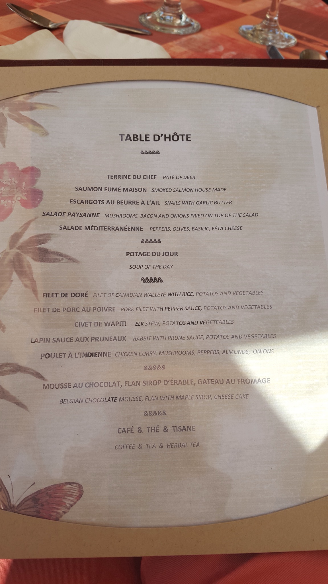 We’ve found that dinner is often offered as well.  So we opted to eat dinner at the B and B.  We were seated on the screened in porch overlooking the lake (or Lac in French) and the temperatures were cool and I actually needed my sweater before dinner was over.  The owner of the B and B speaks no English, but he has wisely printed his French menu, with English translations to the side.  We were able to choose each course, which was easy with the translations and we enjoyed the scenery and the temperature while waiting for our food.