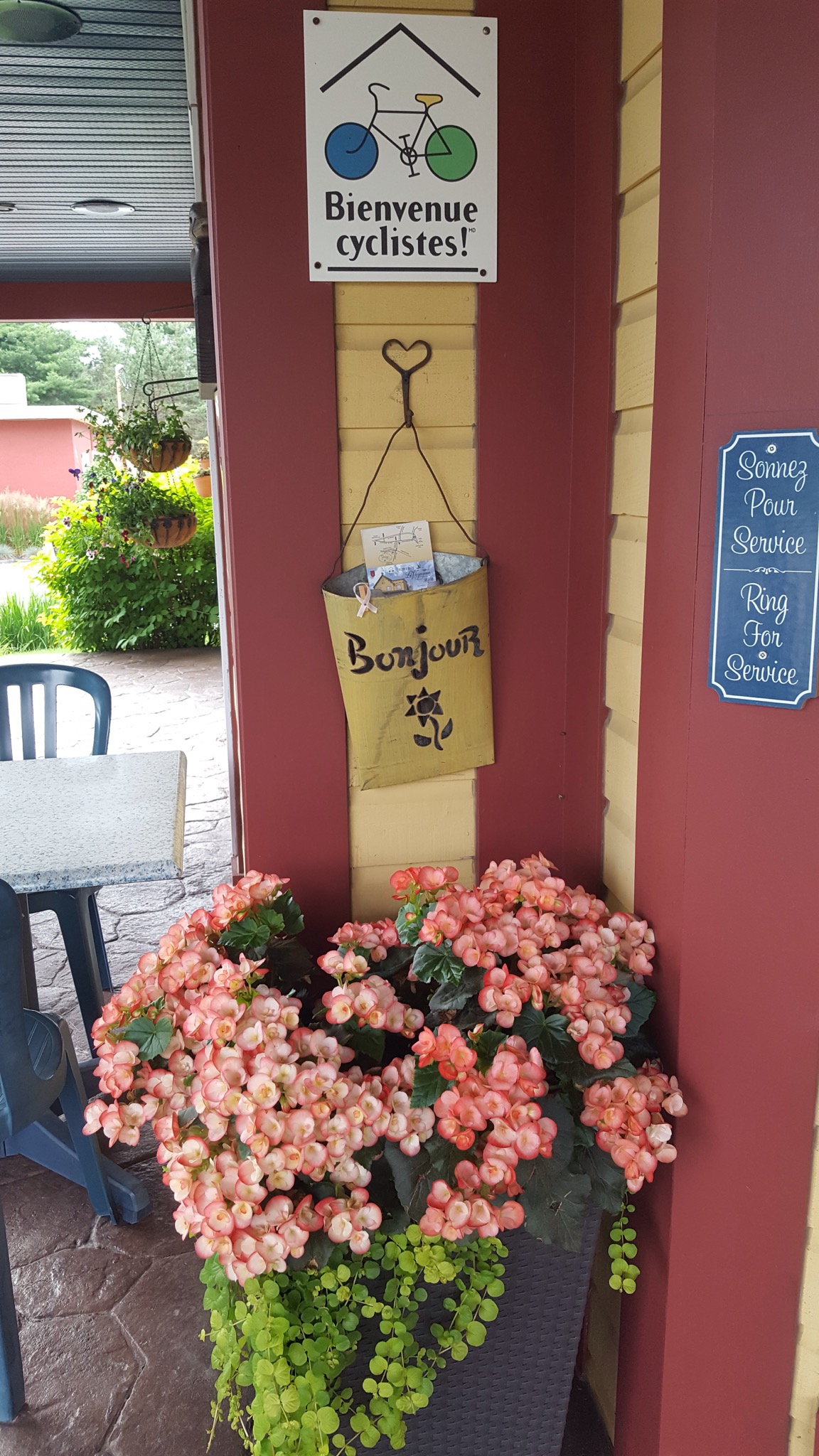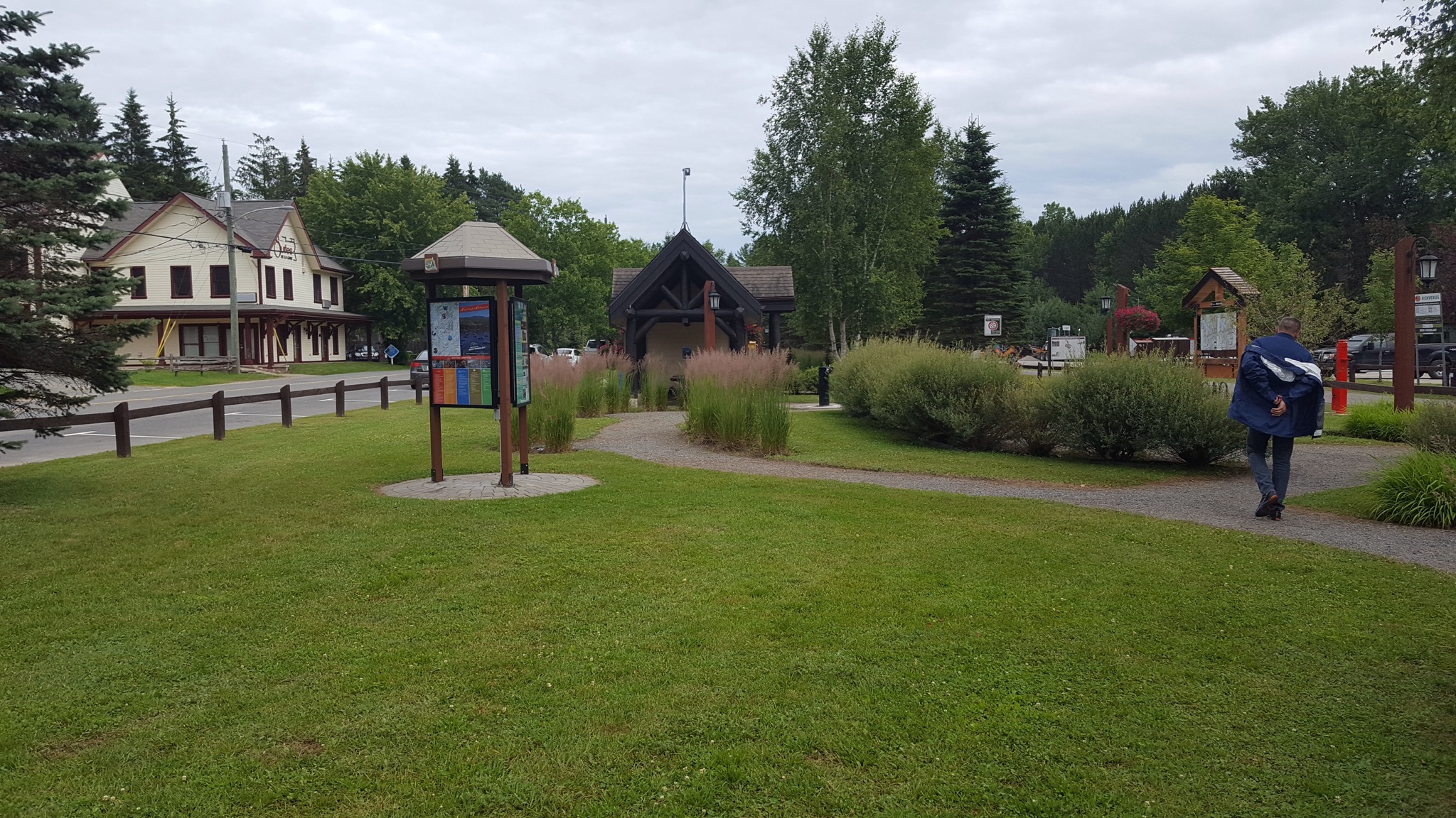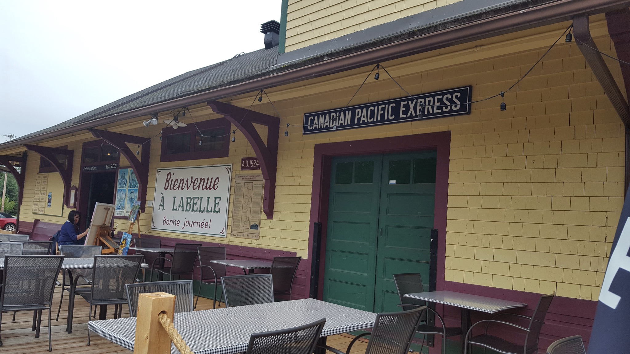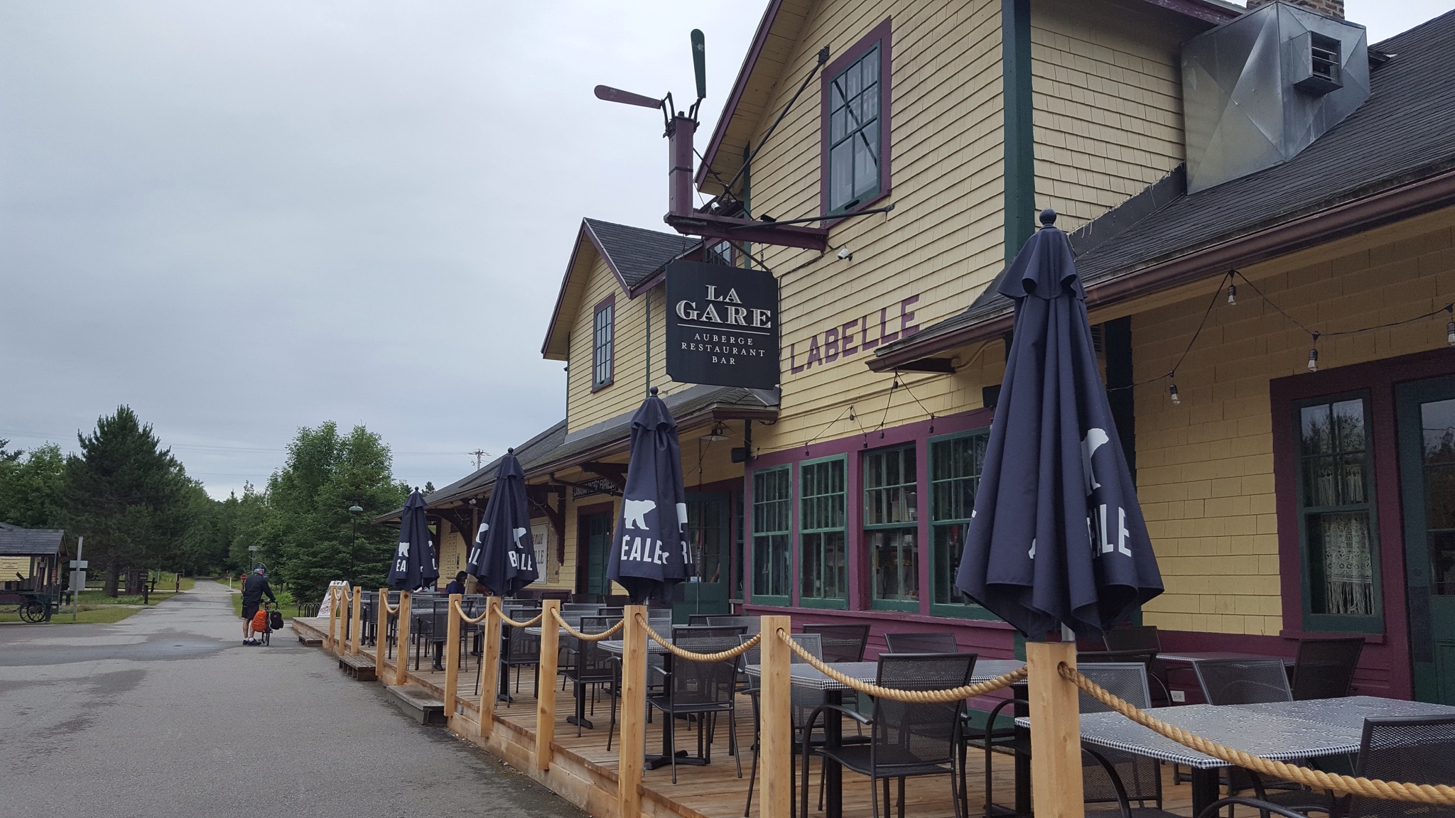 We covered a new section of trail today, making our way South toward Mont Tremblant. The rain was not bad, just a light misty drizzle, and it stopped all together around lunch time. We’d ridden about 7 or 8 miles when we came upon a historic train depot. Many of the original depots still remain along the old rail line, and the ones that do, have been repurposed for folks to enjoy today. They are beautiful on the inside and on the outside. We’ve peeked into several so far, and they always have big hanging baskets of flowers hung under the eaves, and the inside of the depot remains mostly unchanged. Hardwood floors and old hardware still in place. Some are used as museums, telling a little about the local community, some have restaurants or cafes and some have displays of artwork by local artisans.