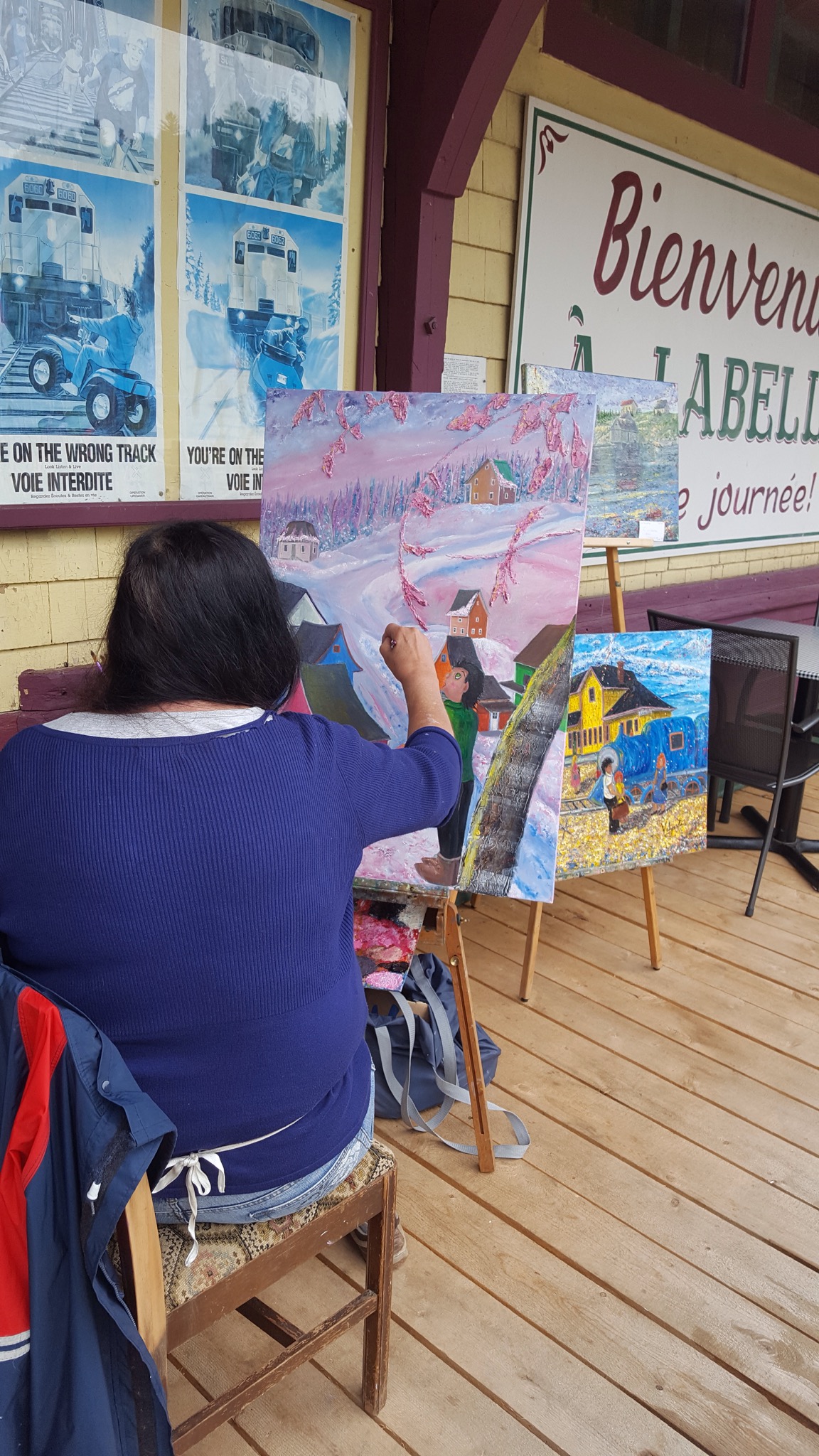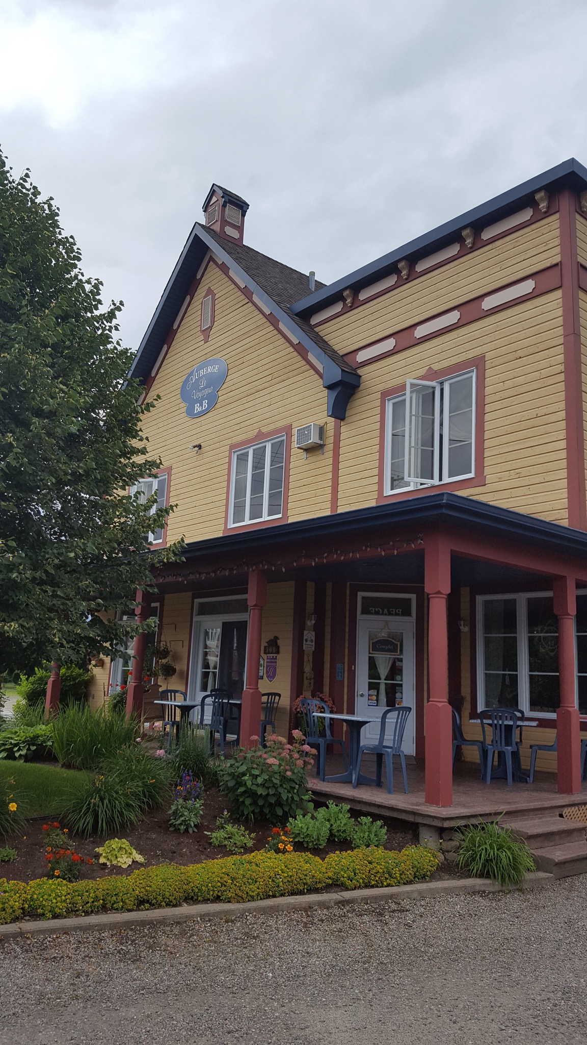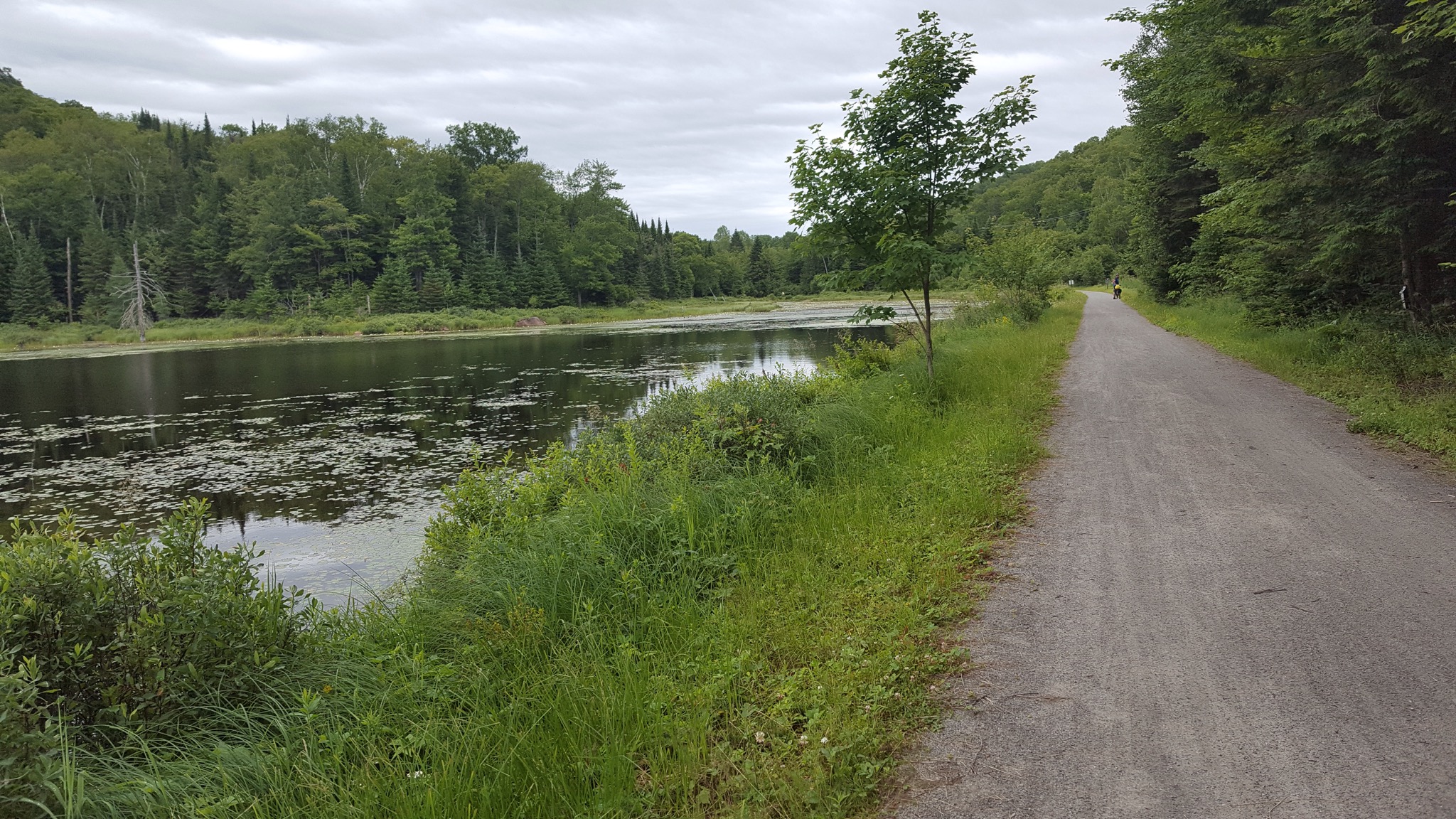 We covered a new section of trail today, making our way South toward Mont Tremblant. The rain was not bad, just a light misty drizzle, and it stopped all together around lunch time. We’d ridden about 7 or 8 miles when we came upon a historic train depot. Many of the original depots still remain along the old rail line, and the ones that do, have been repurposed for folks to enjoy today. They are beautiful on the inside and on the outside. We’ve peeked into several so far, and they always have big hanging baskets of flowers hung under the eaves, and the inside of the depot remains mostly unchanged. Hardwood floors and old hardware still in place. Some are used as museums, telling a little about the local community, some have restaurants or cafes and some have displays of artwork by local artisans.