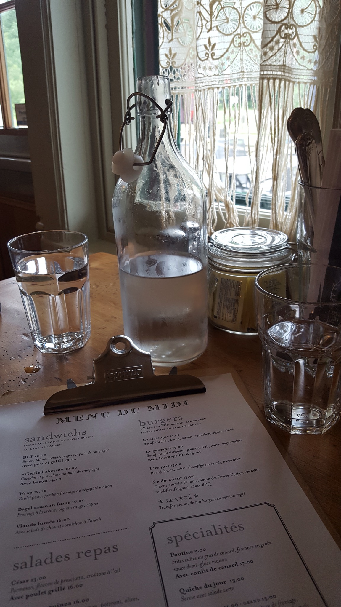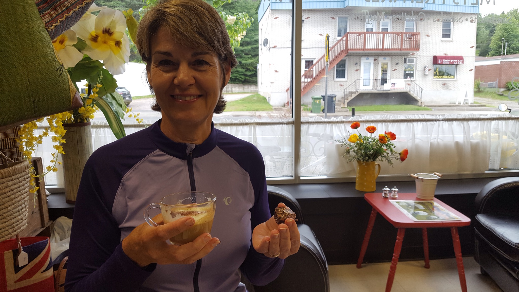 We talked to the young lady staffing this one, and asked her where we might get a cup of coffee to warm up. She pointed us to a little place right around the corner, on the Main Street running right through the town. We found it easily, parked the bikes and went inside. We were greeted in French by the owner, but as soon as she realized we didn’t speak French (which was within the first second of conversation), she switched to English.