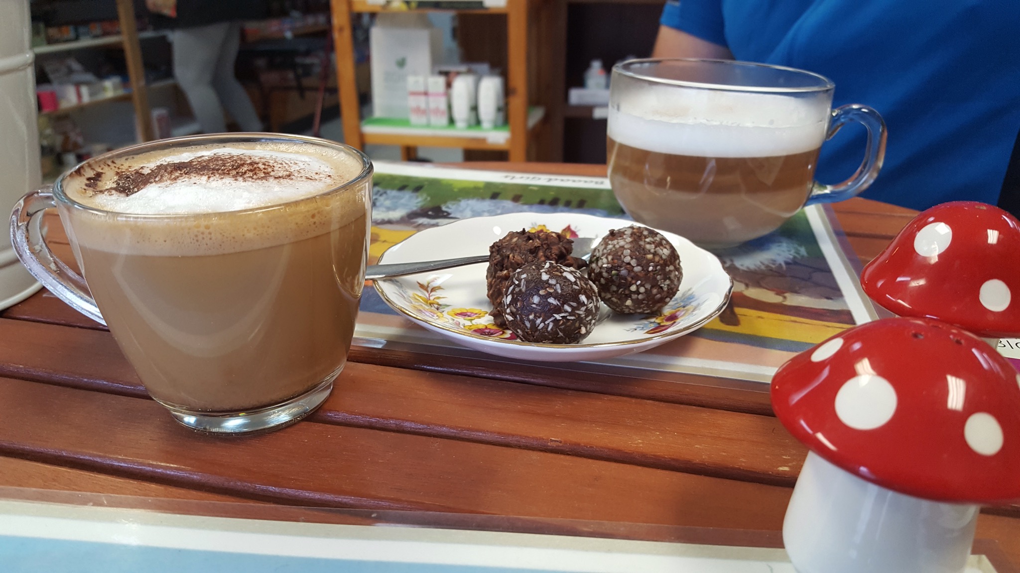 She asked what we would like for her to make us, and we said we wanted something hot! She also had on display 3 different types of Energy bites, something she’d made out of healthy ingredients that was sure to give us energy, so we ordered one of each. She asked questions about where we were from and about our plans as she made our coffee. It hit the spot, and I’m quite sure I felt more energetic after drinking a cappuccino and eating 3 pieces of candy.