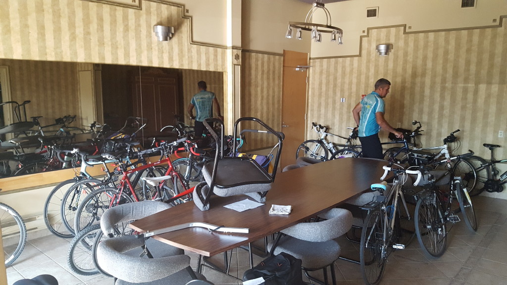 Today’s ride has been one of our favorite days (have I said that every day?). The morning started out clear and cool, just 44 degrees, so we took our time retrieving our bikes from the storage area in the hotel. Something we’ve appreciated about the lodging arrangements is that each place has had secure storage for the bikes. No need to leave them outside on a bike rack! The storage at this hotel was in an unused conference room. When we went down to get the bikes, it was apparent that we weren’t the only bikers staying here, and we weren’t the only bikers that don’t leave the bikes outside, lol.