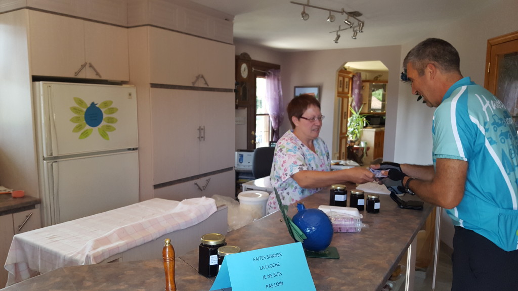 But back to the house with the blueberry lawn art. I thought it might be a place to buy blueberry products, but couldn’t tell for sure if it was a private home or a business? There was no signage on the house itself, just the one small sign beside the driveway. I had to find out, so I went to the door and knocked. (I noticed Jimmy stayed back at the end of the driveway with his phone poised to take a picture, just in case it was something he could submit to funniest home videos). A lady opened the door and I said, “Hello, is this a market? For blueberries?” She smiled and said “oui, oui”, and motioned for me to come in. I called for Jimmy to come in, that the coast was clear, and he joined me as we stepped inside. We had stepped into a home kitchen that had been converted into a little home business.