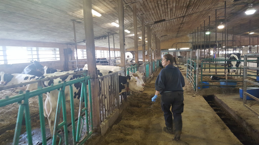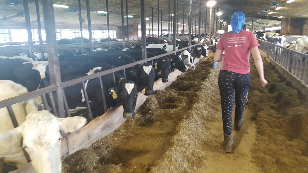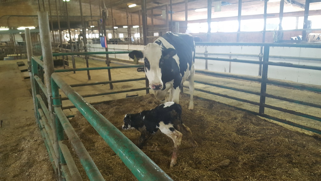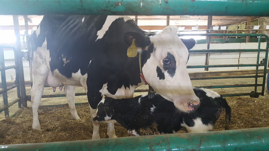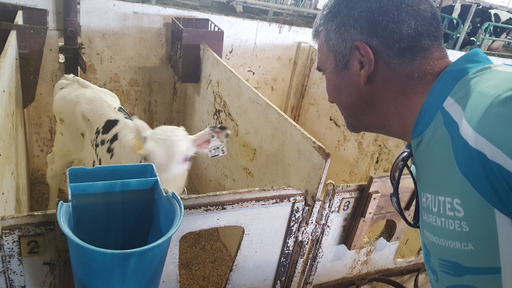 I could hear two women talking in the front office with the door open to the outside where I stood. I walked up the steps to the open door and said, “Hello”, they both stopped their conversation, looked at me and answered “Bonjour”. I asked, “Do you have items for sale or do you offer tours?” I didn’t see any type of sales in the room we were in. In fact it was just an entryway into a massive barn. They both looked at me for a second, and I rephrased my question a time or two to see if they could understand. Finally they did, and said excitedly, “ oui, oui, come!” The young woman explained (in very good English) that the two of them would show us around the dairy farm, and motioned for me to follow them. (I think my Kentucky accent was hard for her to understand initially. I sometimes have that problem even in the U.S.) I called to Jimmy to come on in (noticing that he’d hung back again, probably waiting to see if I would get escorted off the property, lol). The young woman explained that the older woman would give the information in French, and she would serve as interpreter. The Gaston Morin Dairy Farm has been in existence since the 1950s and is a family owned operation, passed down from father to son we learned. Together, the two women took us through every building, explaining the different groups of cows, how they are cared for (very well!) and all that goes into the production of milk. We saw a brand new calf struggling to get to his feet as the momma cow licked him.