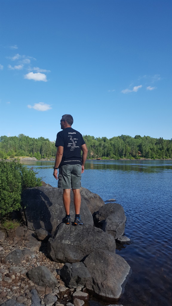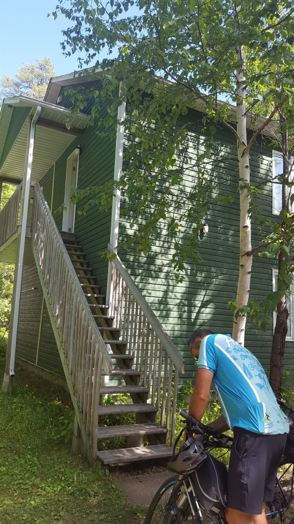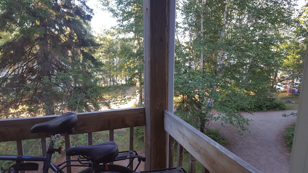 We are staying on the second floor of a cabin overlooking the river. It’s very basic, no plush amenities, but it is beautiful. There’s no A/C, but it is so cool outside, we will sleep with the windows open. Bike storage tonight is our deck, so we had to take both bikes up a flight of stairs and through our room to access the second story deck.