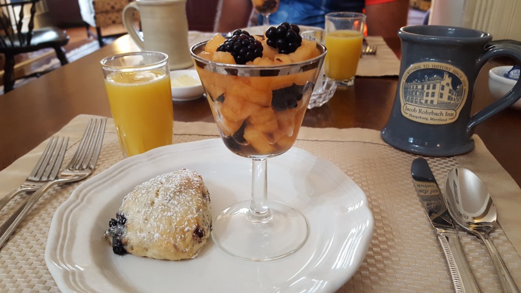 Our Civil War education continued this morning at breakfast. The owner of the B&B (Jacob Rohrbach Inn) is a very knowledgeable history buff, hosting a Civil War lecture series each Wednesday evening during the summer in the backyard for anyone interested. The other guest at breakfast was a high school history teacher from Massachusetts. He was also a passionate expert on the Civil War! He was doing a tour of Civil War battlefields and would be seeing Antietam today. When he arrived at the National Cemetery near the battlefield yesterday, he asked a ranger if there was any information about where those killed in the battle had been buried. He was able to find his great great grandfather’s grave. No one in the family knew where he was buried following his death in the battle of Antietam, until yesterday. You could tell it was an emotional moment for him. The breakfast was delicious, and we ate every bite!