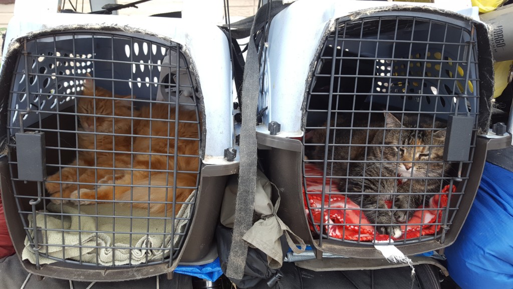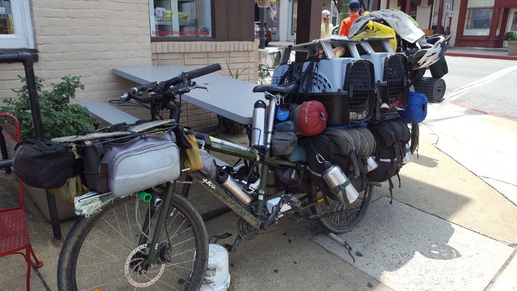 We spotted a bike parked out front, fully loaded with more gear than I’ve ever imagined possible, with 2 cats in crates to boot! The man that owned the bike was biking cross country. He does it every year with his 2 cats. The cats seemed very content to patiently wait for him to finish eating. The owner told us later that he stops by her cafe every year on his cross country trek, which he finances by washing windows. He offers to wash hers for $35 plus a meal. The windows looked really nice and clean and he got a good meal plus $35!