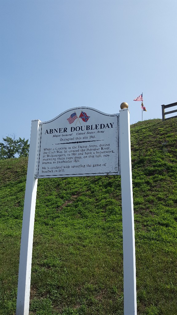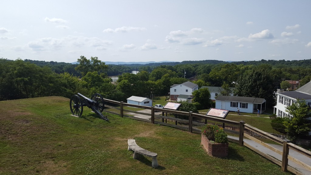 A police officer making rounds stopped us as we walked along and chatted with us a bit. He noticed my bike shirt that listed Bikeworld in Paducah, KY and asked us about our trip. We talked for a few minutes then parted ways. We strolled on down the main street checking out shop windows and killing time. We came to an intersection and were waiting to cross when the same police officer came down the side street in our direction. He’d walked around the block trying to intercept us because he’d forgotten to tell us about Doubleday Hill. Once he pointed it out to us, we could see it from the intersection but would have missed it otherwise. We thanked him and said we’d walk to the hill right then and see the civil war site. It was a beautiful view of the Potomac River and the town from on top of the hill.