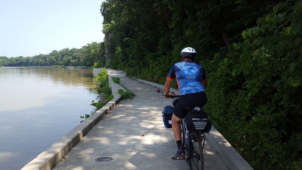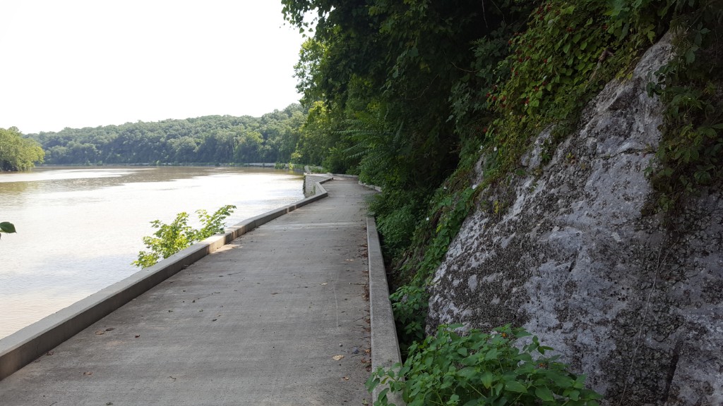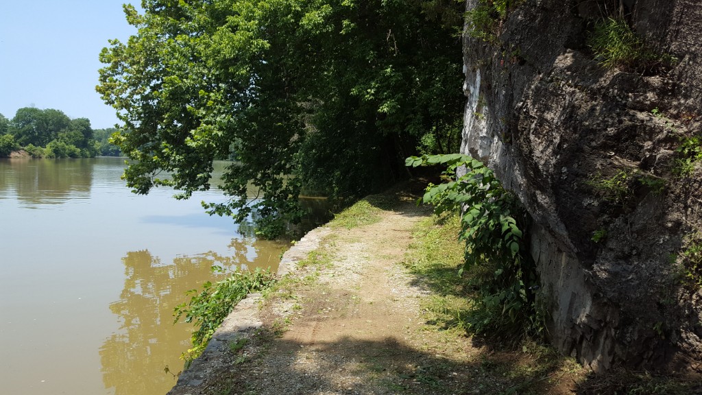 We parted, with wishes for a good day as we went our separate ways. Soon the trail took us through the Big Slackwater section of the canal. When the canal was dug, there was a 3 mile section that had to be bypassed because of the stone cliffs so near the edge of the Potomac. Canal engineers knew it would be almost impossible to blast a canal 60 feet wide and 6 feet deep into the limestone cliffs. The builders decided to use the river instead of continuing the canal for that section. The function of Dam 4 was to slow down the swift current in the Potomac River so it could be used as a substitute for the canal. They still had to blast rock, but only for a narrow towpath for the mules right along the river’s edge. Much of that towpath was destroyed by flooding and erosion years ago, but the National Park Service has restored the missing towpath with concrete right over the edge of the river, reestablishing the old towpath alignment. It is a beautiful ride with the river on one side and the sheer granite cliffs dripping with wild raspberries and wildflowers on the other.